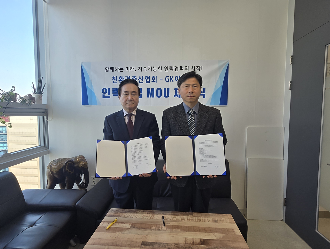 사단법인 친환경축산협회(회장 이덕선, 대표 안기홍)와 ㈜GK아너스(대표 권혁관)는 지속가능한 축산산업 발전과 인력자원 교류 활성화를 위해 '축산산업 인력 상생협력 업무협약(MOU)'을 체결하였습니다.